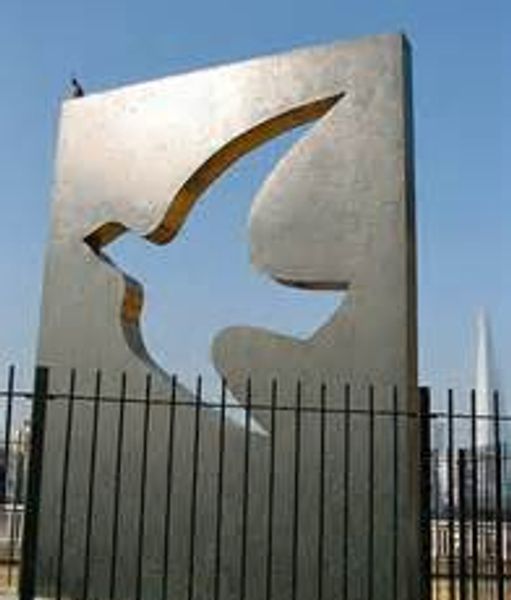 Taylor also sculpted the Dove Memorial, at the nearby Hermitage Riverside Memorial Gardens. After twenty years of struggle and fund raising by dedicated local residents, the Council was persuaded to build the Gardens instead of concreting over the site of Hermitage Wharf. The Gardens were dedicated to the memory of the East End civilians who died in the Second World War, a sentiment shared in the Dove Memorial: while it represents hope, the cutaway shape of the bird symbolises the civilians who lost their lives. The sculptor donated her fee to the local resident fundraisers.